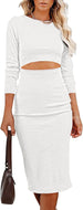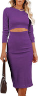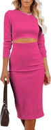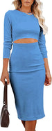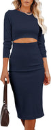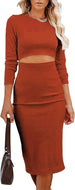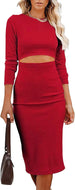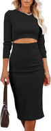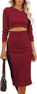 Women Long Sleeve Bodycon Dress Casual Fashion Crewneck Cut Out Knit Ribbed Slim Midi Pencil Dress